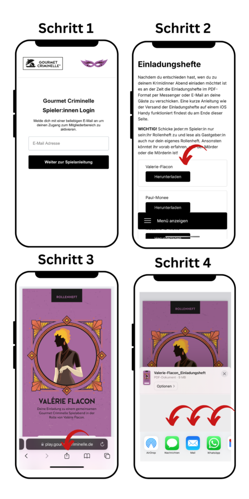 Nachdem du entschieden hast, wen du zu deinem Krimidinner Abend einladen möchtet ist es an der Zeit die Einladungshefte im PDF-Format per Messenger oder E-Mail an deine Gäste zu verschicken. Eine kurze Anleitung wie der Versand der Einladungshefte auf einem iOS Handy funktioniert findest du am Ende dieser Seite.